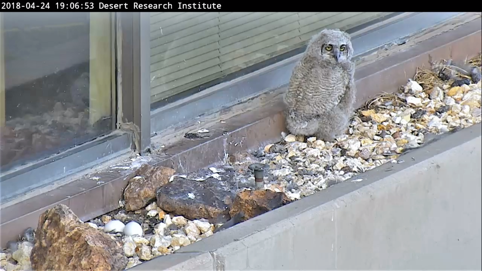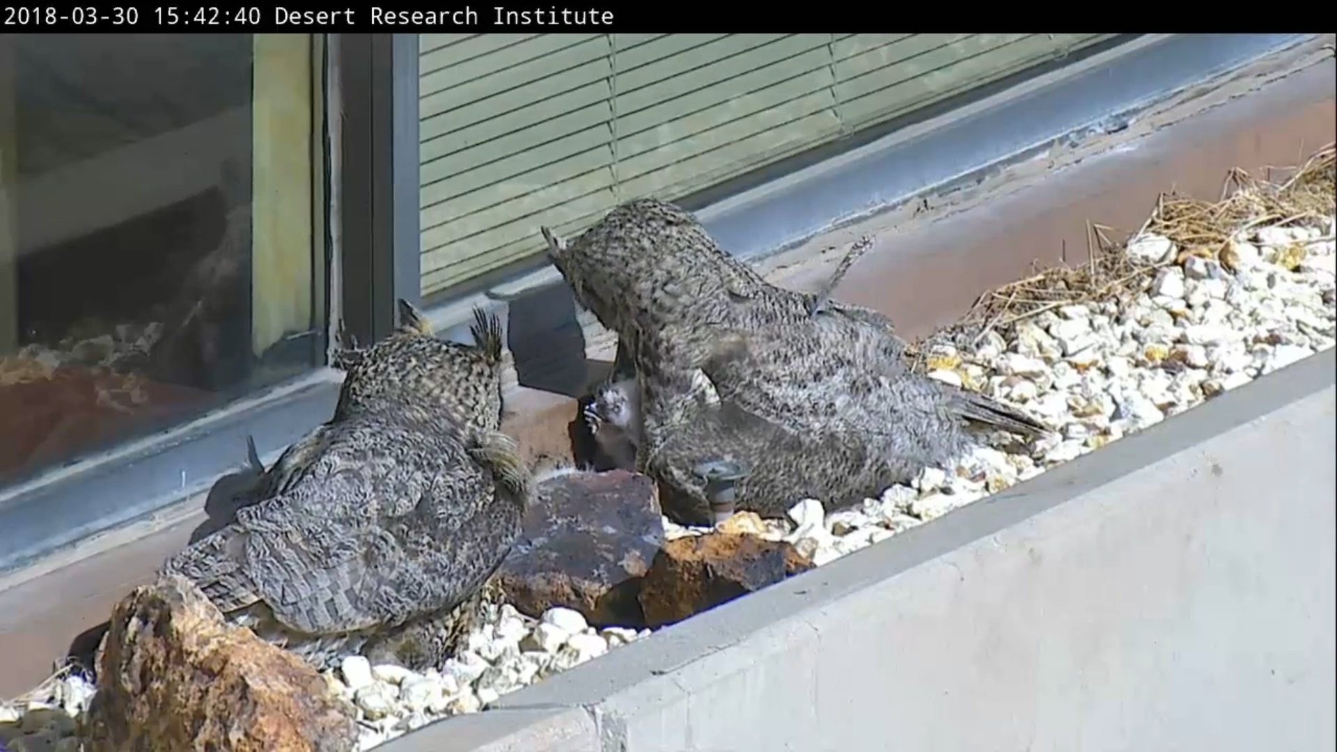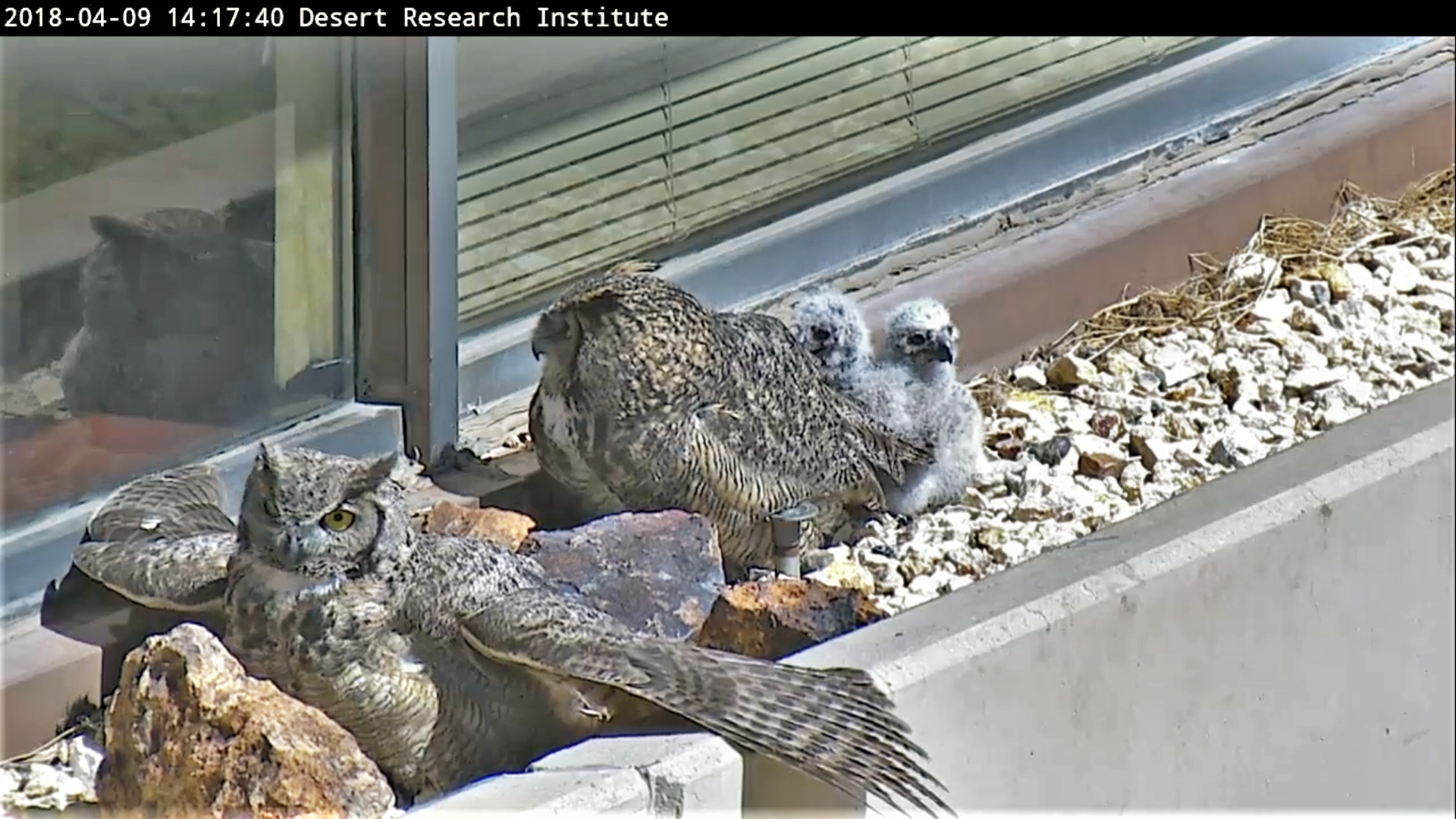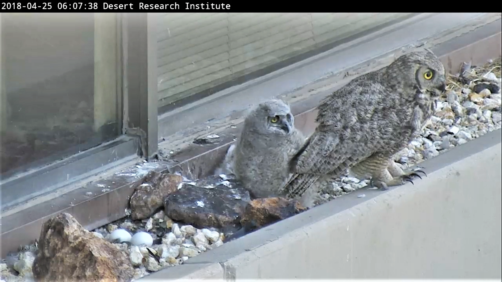 リノ北部にある砂漠研究センター(the Desert Research Institute) のビルの2階の窓棚でなんと野生のアメリカワシミミズク (Great Horned Owl) の雌2羽が巣ごもりし卵を温めている様子がYoutubeのWEBカムで生中継で見られます☆彡  巣は発見されてからネバダ州管下の Nevada Department of Wildlife (NDOW) のスタッフによって保護監視され3/15(木)からWEBカムを設置したそうです。5/7(月)に巣立ちしたため、終了しました。