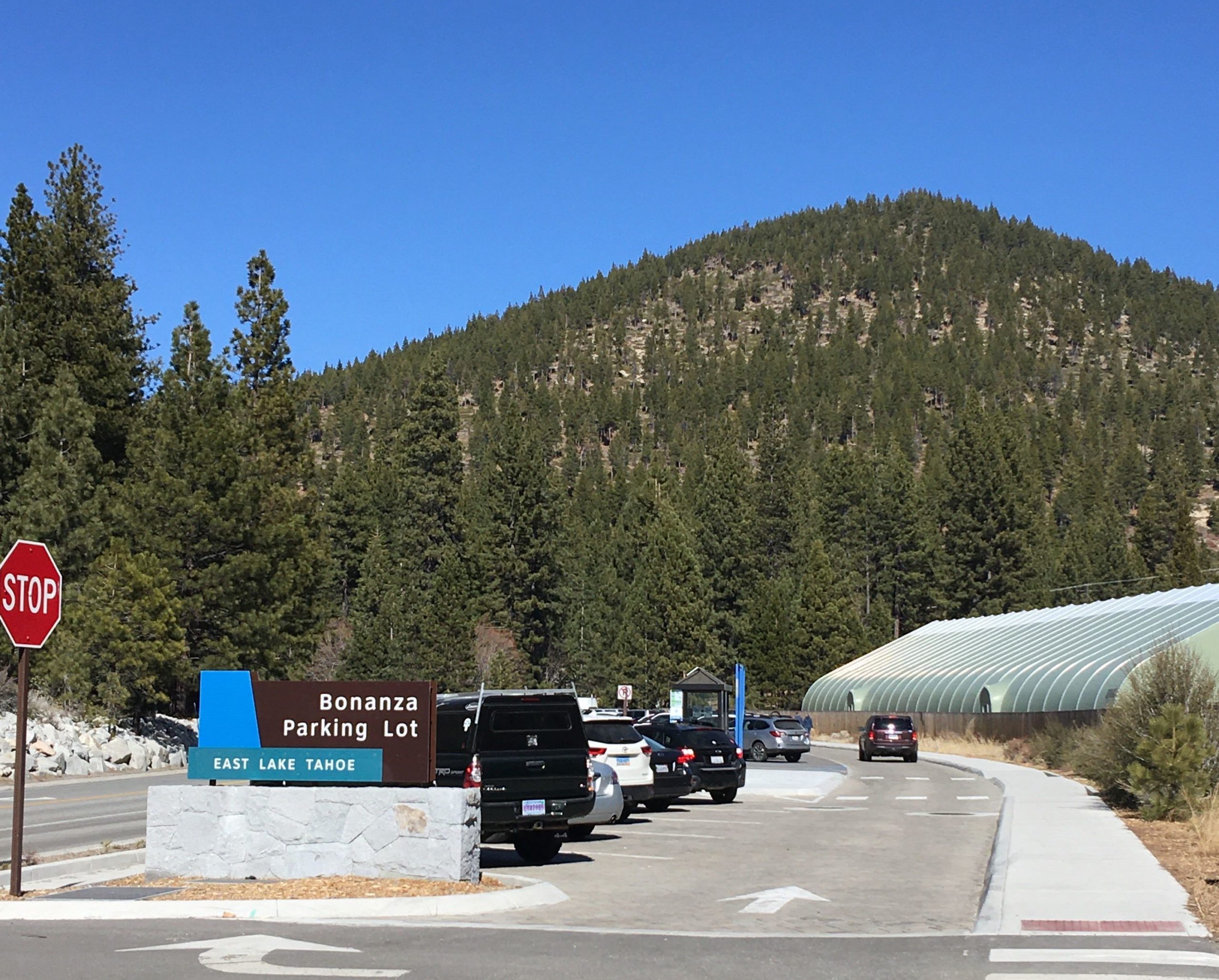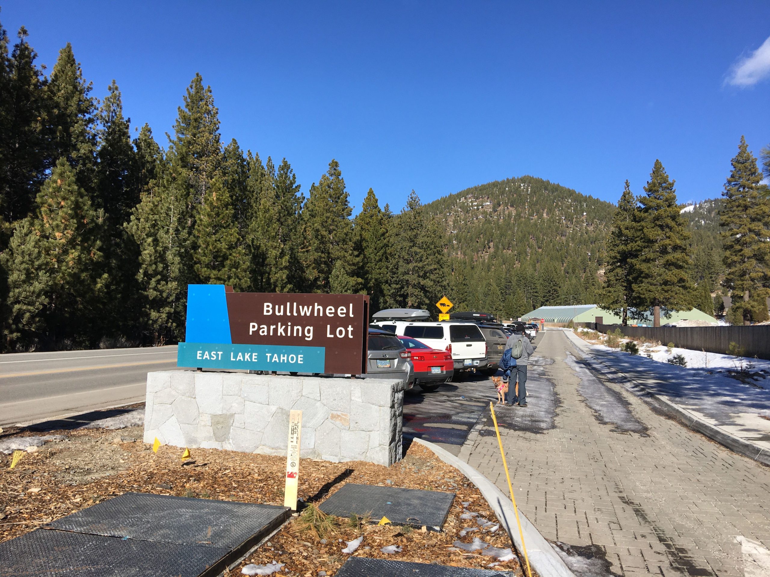 さて、タホ湖で遊ぶのに最も気になる駐車場ですが、トレイルの北側スタート地点に91台分完備されてます。SR28(州道28号線)をIncline Villageから南東方面へ下り街が終わるちょい手前左のPonderosa Ranch Roadと交差するSR28の東側側道に駐車場があります。タホ湖周辺の駐車場は激戦区で特に週末は朝早く来ないと!とよく言われますが、日曜とはいえ冬だからか午前10時半に着いて半分程しか埋まっておらず楽勝でした。尚、Sand Harborからスタートする場合は州立公園入園料$10支払いの上州立公園の駐車場を利用できます。公園は開園時間が限られてますのでこちらで確認を。